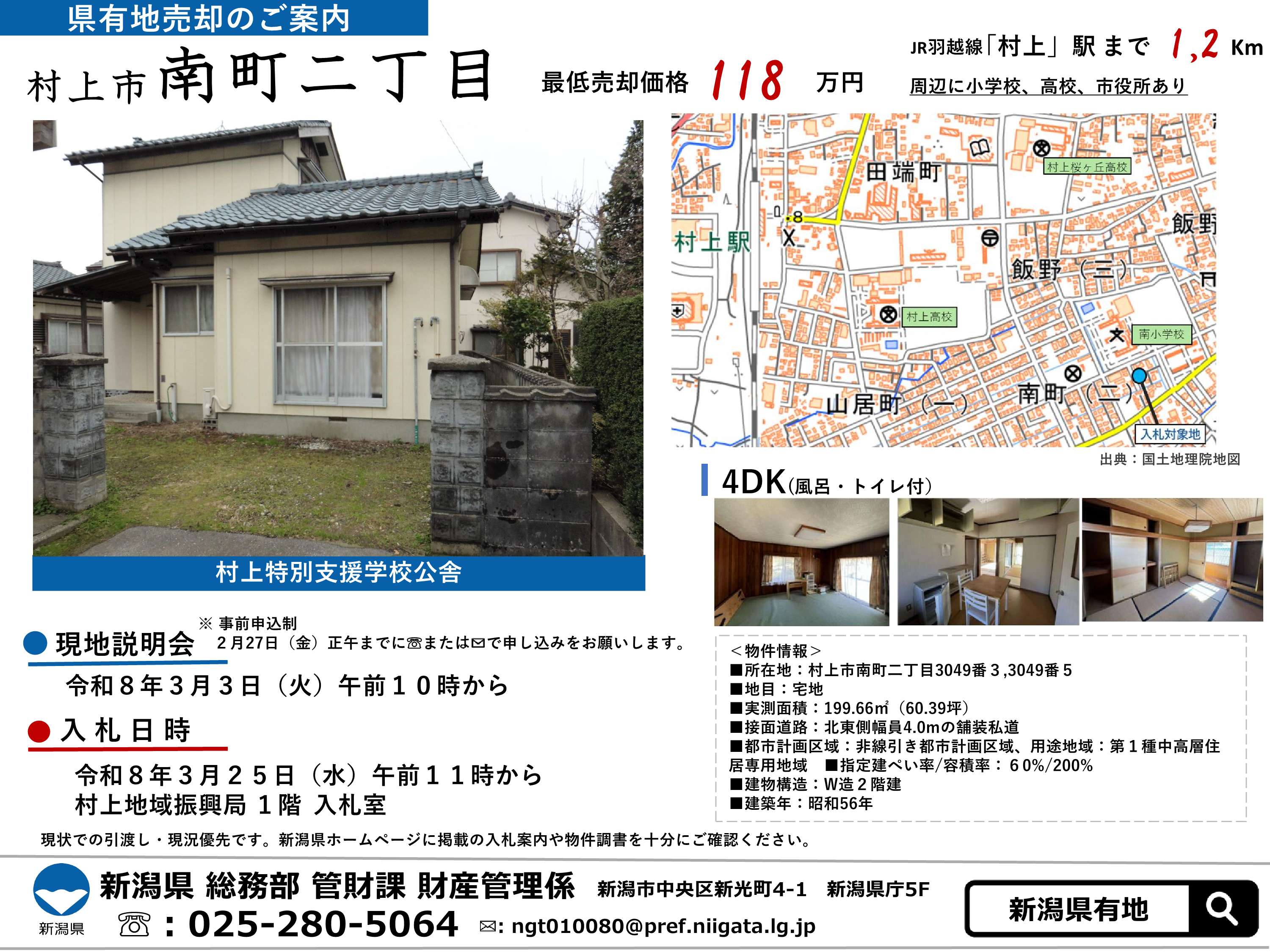県有地の売却/村上特別支援学校公舎(一般競争入札、入札日 令和8年3月25日)管財課
