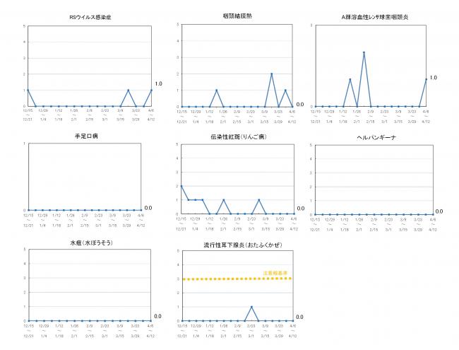 RSウイルス感染症・咽頭結膜熱・A群溶血性レンサ球菌咽頭炎・水痘・手足口病・伝染性紅斑・ヘルパンギーナ・流行性耳下腺炎の発生動向