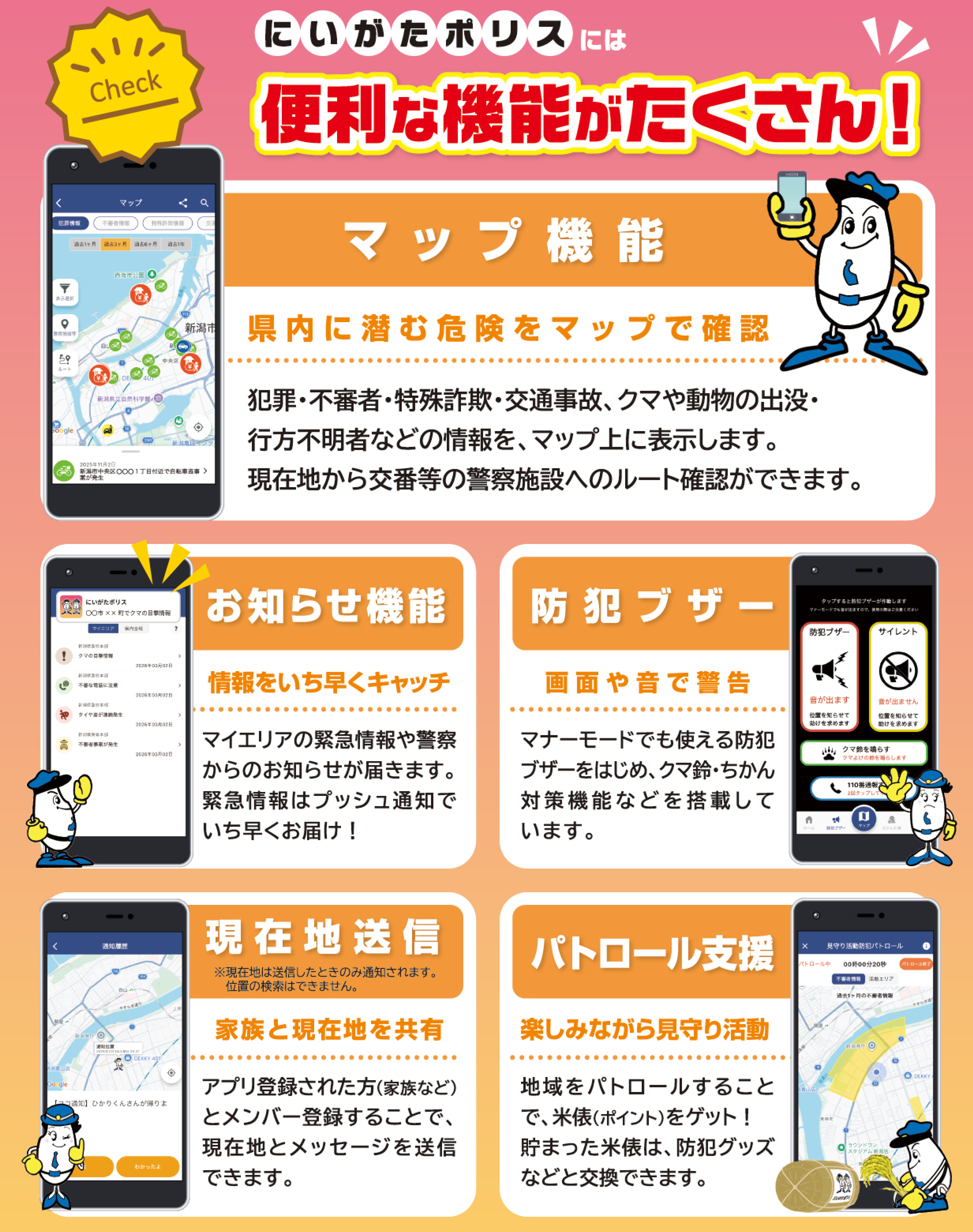 「にいがたポリス」は、新潟県内の犯罪発生情報や防犯情報などをお届けするほか、防犯ブザー機能、ちかん対策機能など安全安心に役立つ便利機能を提供する防犯アプリです。
