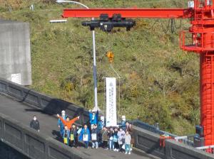 ダム天端にあるクレーンに吊り下げた縦幕を中心に、記念撮影をしました。