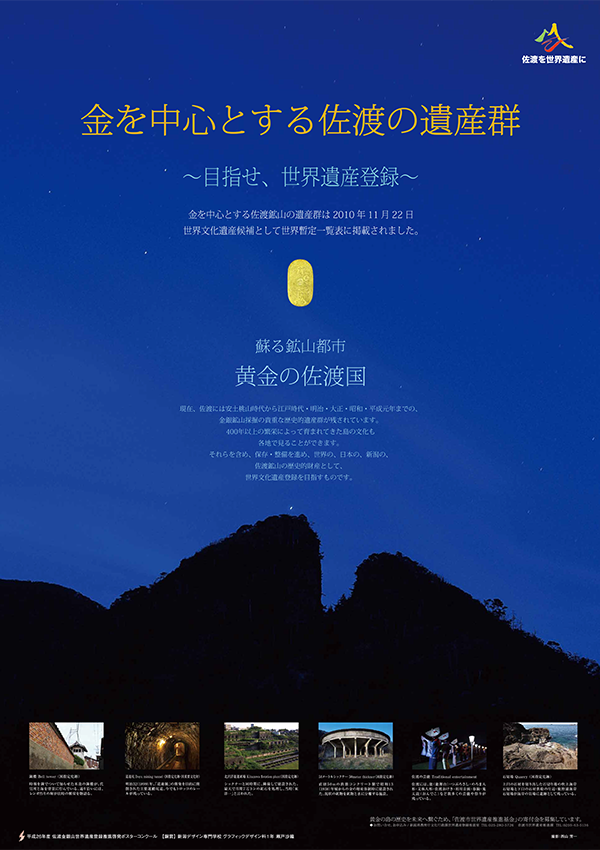 平成24年度に開催した「佐渡金銀山世界遺産登録啓発ポスター展」※の入賞作品を基に、世界遺産登録を目指す佐渡金銀山の啓発ポスターを制作いたしました。