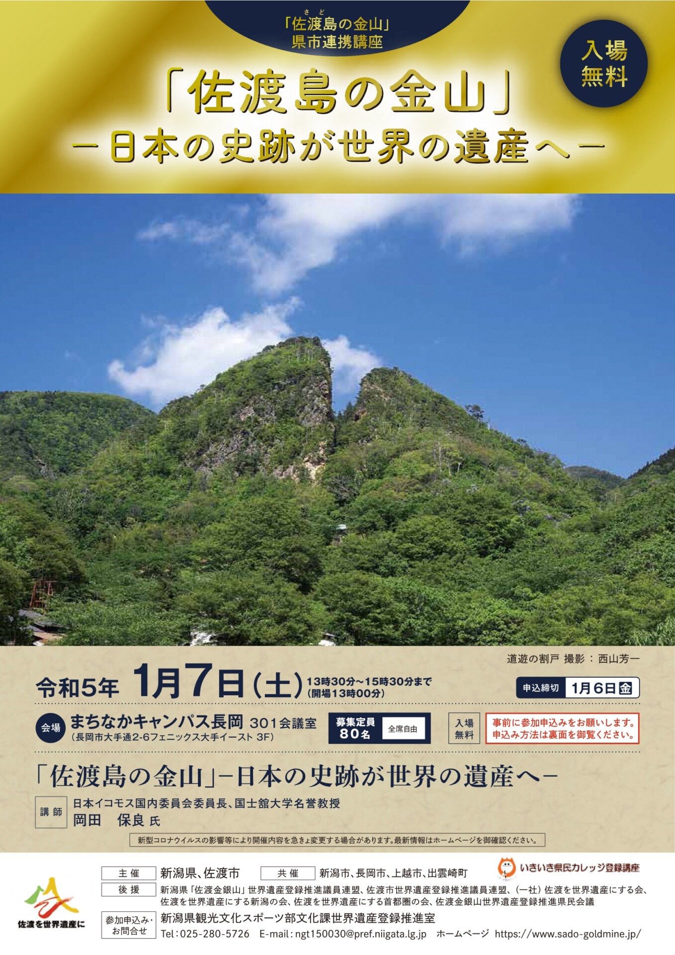世界遺産登録を目指す「佐渡島の金山」の文化的な価値や魅力について、県民の皆様から理解を深めていただくため、本講座を開催します。