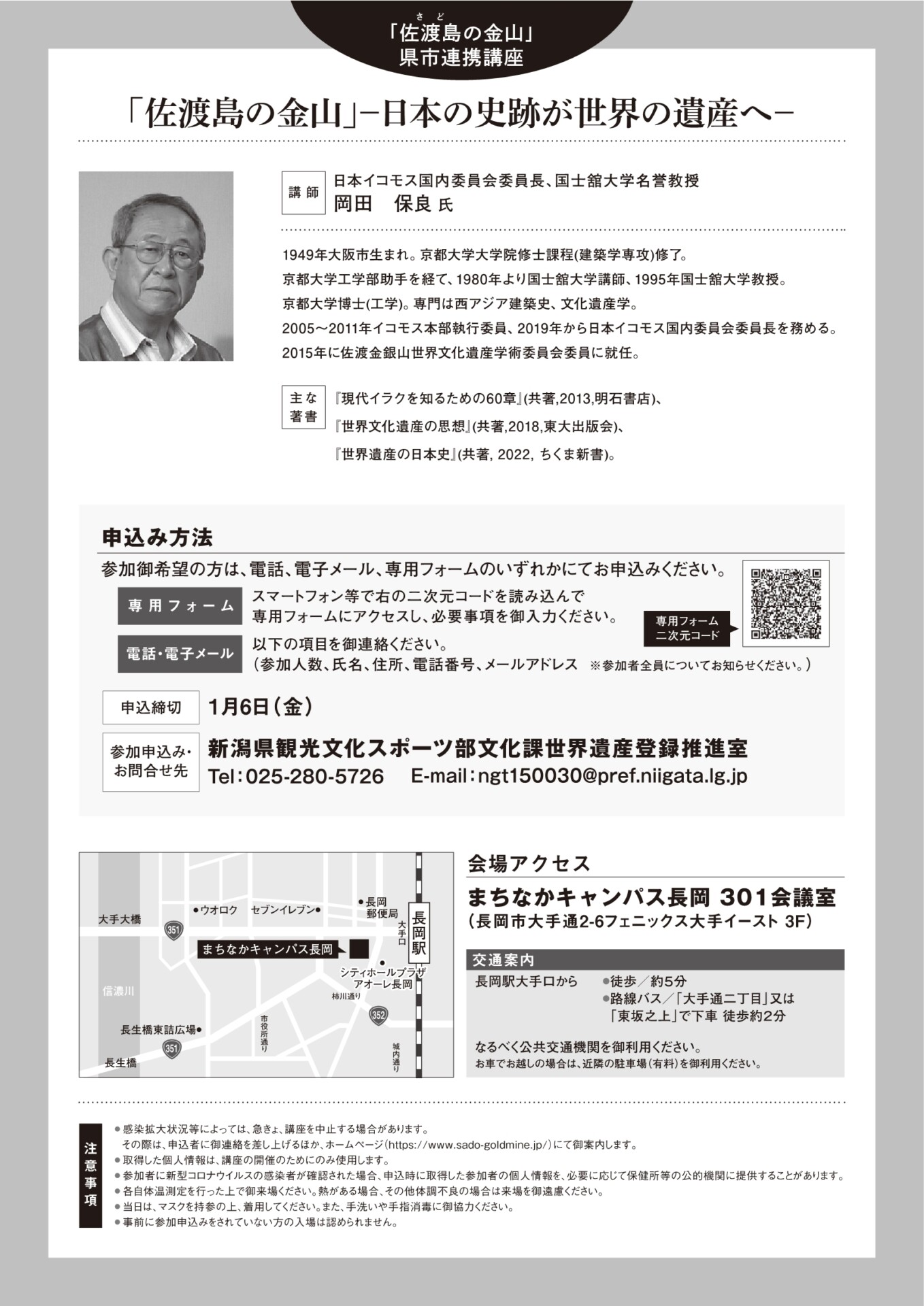 ⻑岡会場では、世界遺産登録に⻑年関わってきた⽇本イコモス国内委員会委員⻑である、岡⽥保良⽒を講師に迎え、「佐渡島の⾦⼭」にはどのような価値があるのかを分かりやすく解説していただきます。
